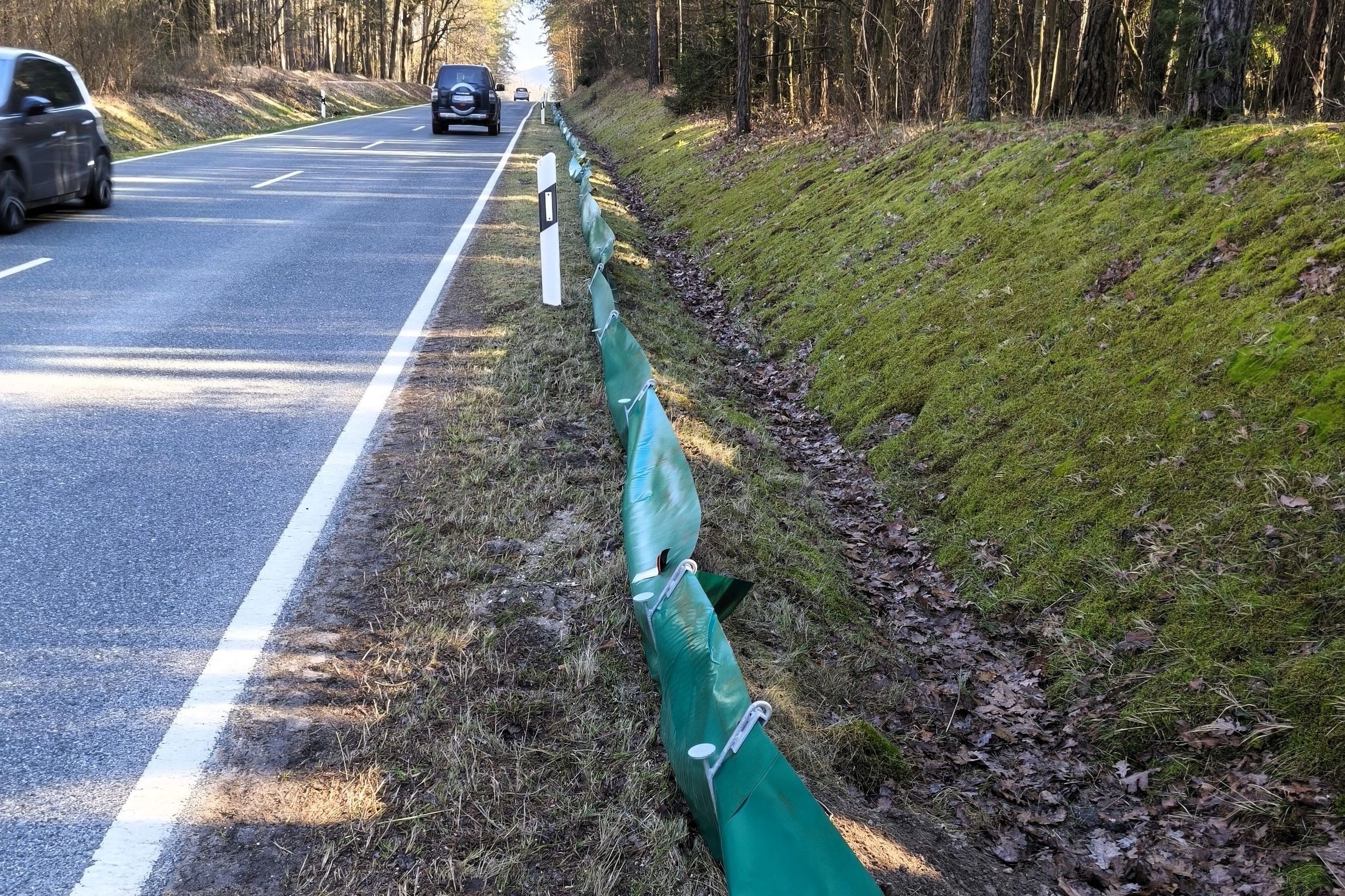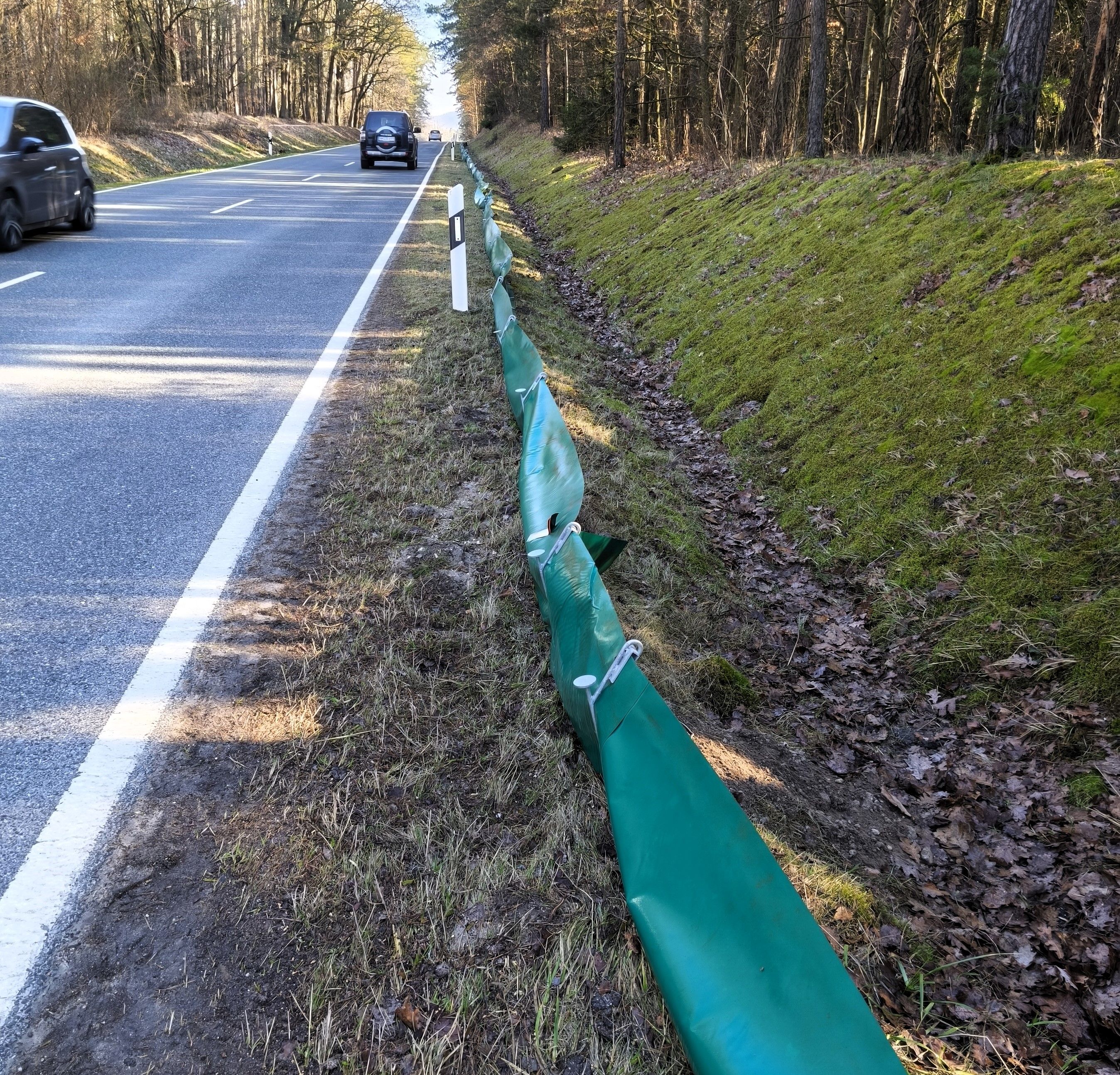 Viele Hunderte Amphibien wurden in den letzten Jahren an dieser Stelle immer wieder überfahren, wenn sie sich aus ihren Winterquartieren im Wald auf Wanderschaft gemacht hatten zum schönen Weiher bei Rocksdorf. Oft hatten Naturfreundinnen und Naturfreunde ein Herz und sammelten die Tiere nachts von der Straße auf, um sie vor dem Überfahrenwerden zu retten. Seit dem letzten Jahr versucht nun der BUND Naturschutz das Massensterben durch einen Amphibienschutzzaun zu reduzieren. 2025 war es noch ein älterer Zaun, aber das Ergebnis war beachtlich. Es konnten fast 1.500 Tiere gerettet und in ihr Laichgewässer gebracht werden. Den neuen Zaun mit ca. 330 Metern hat deshalb 2026 das Straßenbauamt Regensburg aufgebaut. Leider sind wir bei der Betreuung des Zauns nur zu zweit. Wir könnten dringend Unterstützung brauchen. Das muss nicht täglich sein, aber vor allem in der Hauptwanderzeit, wenn manchmal nachts mehrere Hundert Kröten und Frösche auf einmal unterwegs sind. Wer uns unterstützen will, bitte bei Frau Dr. Keil melden: 0177 4330835.