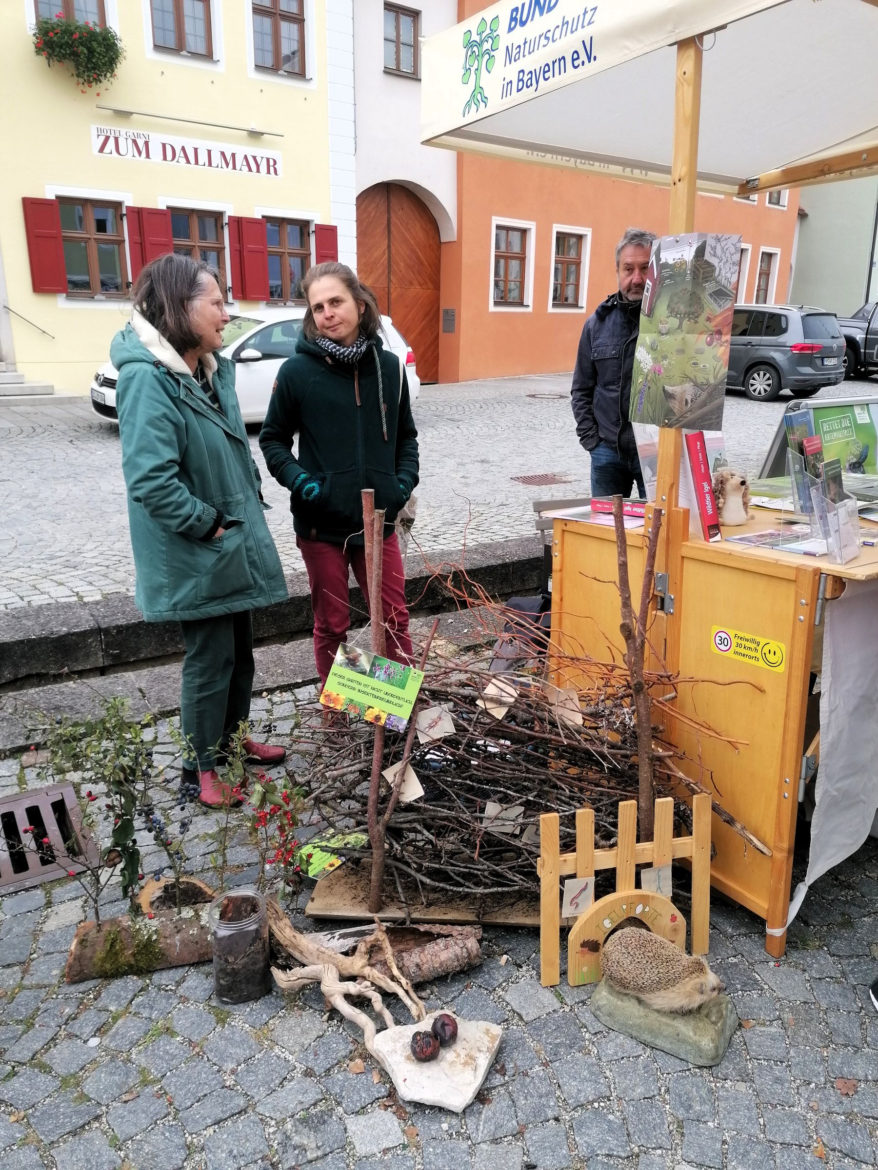 Interesse bei den Marktbesuchern fand vor allem der kleine ausgestopfte Igel der Kreisgruppe. Nathalie Stopfer, Angelika Minet und Dietmar Stenzel warben bei den Marktbesuchern nicht nur für einen naturnahen Garten als Wohnraum für den bedrohten Igel, sondern zeigten auch, wie man eine Benjeshecke anlegen kann. Die Broschüre über richtige Heckenpflege vom Landschaftspflegeverband wurde ebenfalls gerne mitgenommen.