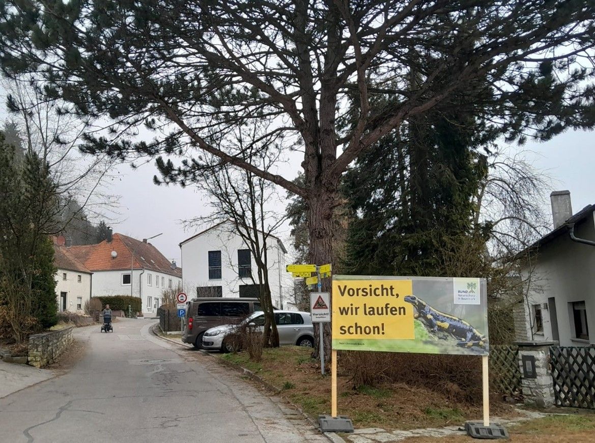 Sobald der Schnee geschmolzen ist und die Temperaturen in der Nacht deutlich über dem Gefrierpunkt liegen, überqueren am Premerzhofener Weg in Dietfurt jedes Jahr aufs Neue zahlreiche Amphibien die Straße. Im Siedlungsgebiet rund um den „Schütterer“ wandern die Feuersalamander-Weibchen. vom Kreuzberg zu den kleinen Bächen und Wassergräben um dort zu laichen. Dieses Jahr hat hier die BN Ortsgruppe Dietfurt mit unbürokratischer Hilfe von den Mitarbeitern des Bauhofs Dietfurt vier große Bannern errichtet um alle Autofahrer:innen für ein besonders vorsichtiges Fahren zu sensibilisieren.
