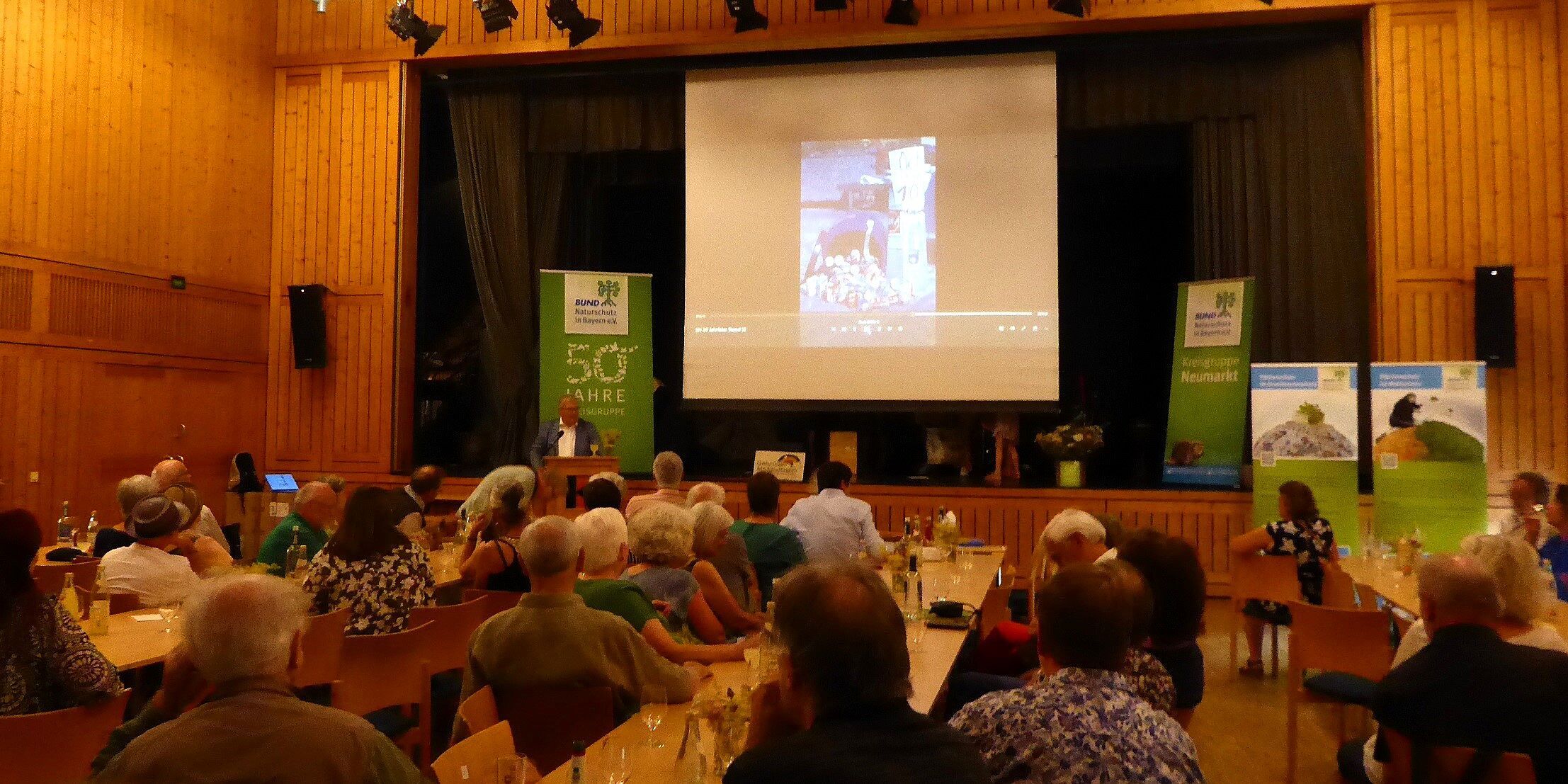 „Der Biber passt als Symbolfigur zu eurer Kreisgruppe“, scherzte der BN-Landesvorsitzende Richard Mergner bei der 50-Jahr-Feier. „Die scharfen Zähne stehen dafür, dass ihr auch mal politisch heiße Eisen aufgreift, und das kuschelige Fell steht für euren Einsatz z.B. beim Artenschutz.“ Damit überreichte er einen Geschenkkorb und lobte die sehr aktive Kreisgruppe. Zunächst aber begann das Sommerfest mit einem Kinderprogramm: Gemüsetheater, Nisthilfen für Wildbienen bohren, Gemüsequiz und Bienchen basteln wurden gerne angenommen. Dazu wurden alle Gäste empfangen mit Butterbrezen, Schnittlauchbroten und kühlen Getränken. Zur Abkühlung gab es auch noch Bauernhofeis. Im Innenhof des Johanneszentrums kamen die ersten Gäste und Mitglieder ins Gespräch und wurden von „Mühlleitner & friends“ musikalisch begrüßt und schließlich in den großen Saal begleitet, wo von Beginn an eine digitale Foto-Schau viele Highlights der Kreisgruppe aus den letzten fünf Jahrzehnten zeigte. Hier eröffnete der Kreisvorsitzende Josef Guttenberger die Jubiläumsveranstaltung. Daniela Gabler und Tanja Meier hatten den Saal mit Blühpflanzen aus dem „Blühpakt Bayern“ geschmückt. Neben Vertreterinnen und Vertretern aus der Kommunalpolitik und verschiedener Ämter begrüßte er auch einige Gründungsmitglieder, die schon vor 50 Jahren für den BN eintraten. Landrat Willibald Gailler betonte in seinem Grußwort vor allem das ehrenamtliche Engagement der Naturschützer. In Vertretung des Neumarkter OB Markus Ochsenkühn ging der Geschäftsführer des Landschaftspflegeverbands, Werner Thumann, auf die Pionierleistung der Kreisgruppe bei der Landschaftspflege ein und stellte eine Spende des OB in Aussicht. Nach einer weiteren musikalischen Einlage der Band gab es als Geburtstagsüberraschung eine von Sigrid Schindler konzipierte „Umweltmodenschau“, d.h. hier wurden Umweltprobleme von Kindern „modisch“ umgesetzt. Das Moderatorenteam Alisha und Keanu begleitete die Models mit satirischen Texten zu Erscheinungen wie Alpensterben, Mülllawine, Ozonloch, bedrohte Tierwelt, Smogalarm, Klimakatastrophe, Waldsterben oder Verpackungsflut. Mechthild März hatte die Kinder organisiert, die begeistert mitmachten und als kleine Belohnung einen Ferienpass des KJR erhielten. Der stürmische Applaus zeigte, dass die Überraschung gelungen war. So eingestimmt ließ der BN-Ehrenvorsitzende Hubert Weiger die 50-jährige Geschichte der Kreisgruppe, die er selbst mitbegründet hat, kurz Revue passieren. Besondere Erwähnung fanden die jährliche Amphibiensammlung, der Einsatz für das Deusmaurer Moor und der Bürgerentscheid für die Bäume im Neumarkter Stadtpark. Aber er fand auch deutliche Worte zu übergeordneten politischen Themen wie z.B. dem Einsatz von Glyphosat in der Landwirtschaft. Hier forderte er ein kompromissloses Verbot, um unsere Lebensgrundlagen nicht noch weiter zu zerstören. Mit langanhaltendem Applaus machten die ca. 100 Zuhörerinnen und Zuhörer deutlich, dass er ihnen aus dem Herzen gesprochen hatte. Sein Dank galt allen, die diese fünfstündige Feier vorbereitet und bestens organisiert hatten.