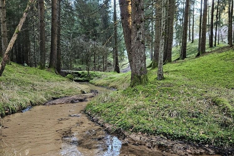 Waldwanderung über idyllischen Wasserlauf und Hohlwege